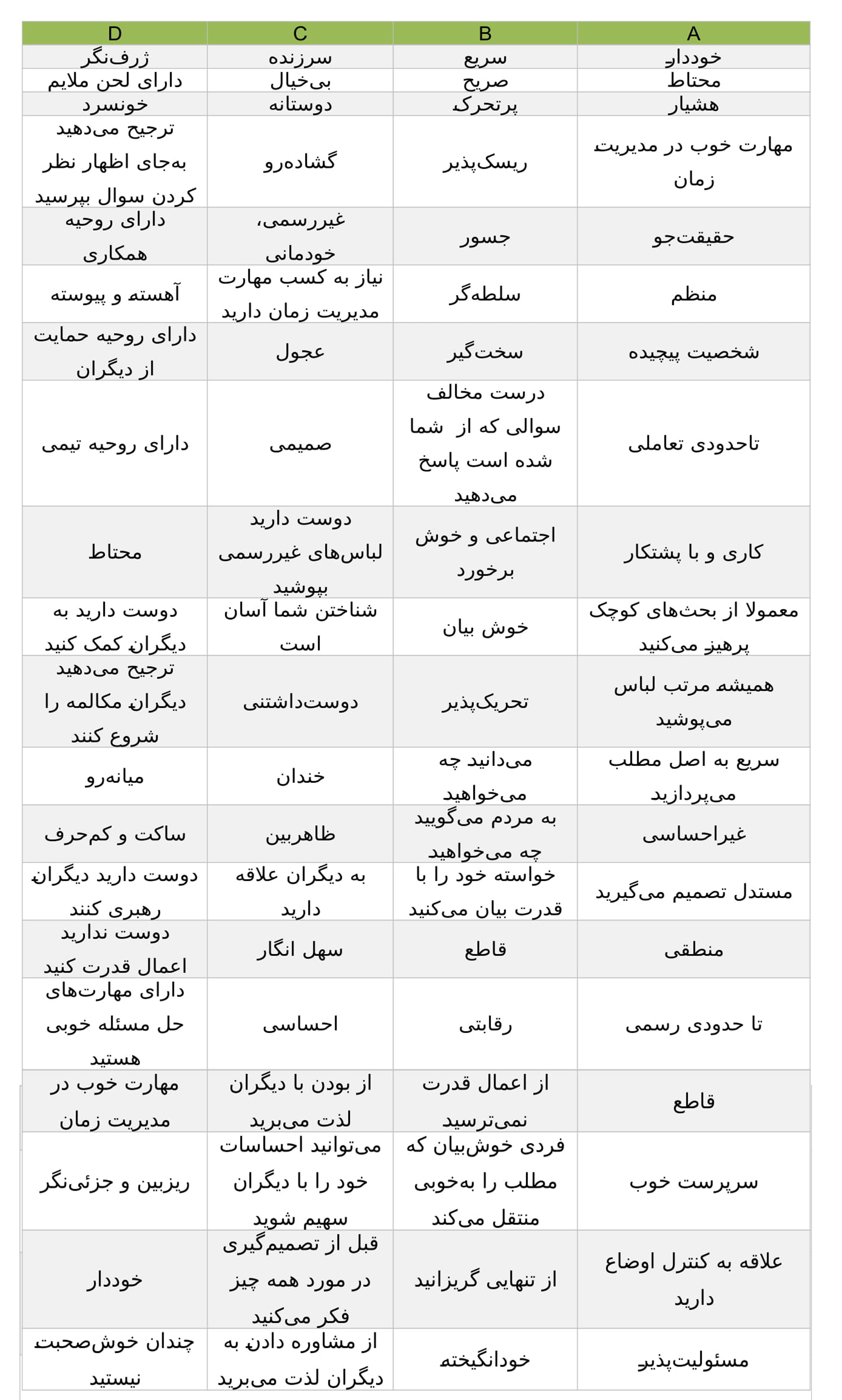 در ادامه پرسشنامهای در اختیار شما قرار میگیرد که میتوانید با کمک آن تیپ شخصیتی خود را تا حدودی مشخص کنید. هنگام خواندن ستونها (از ستون "A" تا "D") ، تمام کلمات و عباراتی را که احساس میکنید شما را توصیف میکنند، علامت بزنید. در انتها تعداد مواردی که در هر ستون علامت زدهاید را جمع کرده و در انتهای همان ستون یادداشت کنید.