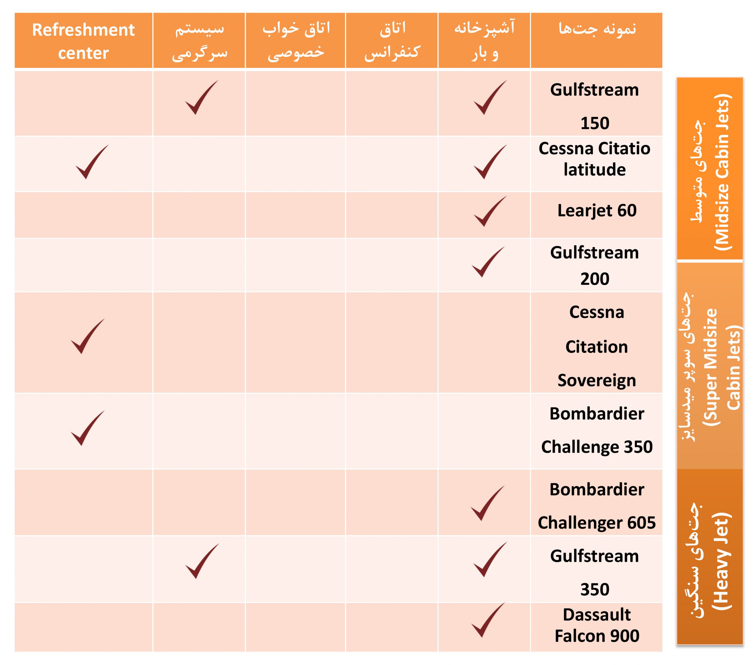 انواع جتها: “Bombardier Challenger 605” ،“Gulfstream 450” و “Dassault Falcon 900” برخی از نمونههای جتهای سنگین است.