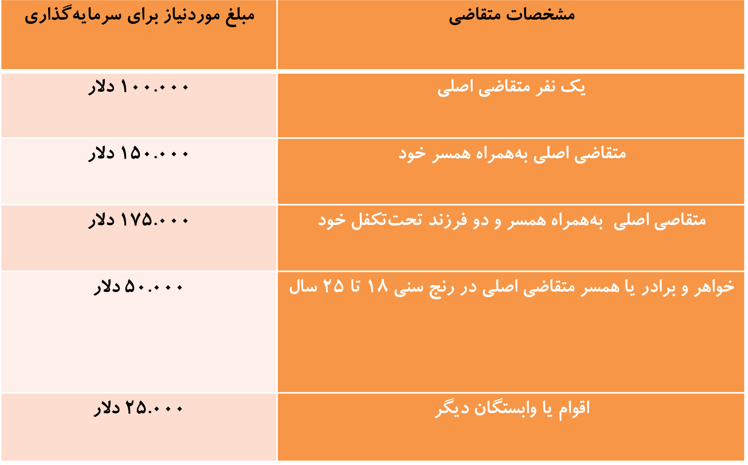 مبلغ قابلقبول برای سرمایهگذاری در پروژههای دولتی حداقل ۱۰۰.۰۰۰ دلار بوده و متناسب با تعداد و سن متقاضیان متغیر خواهد بود.