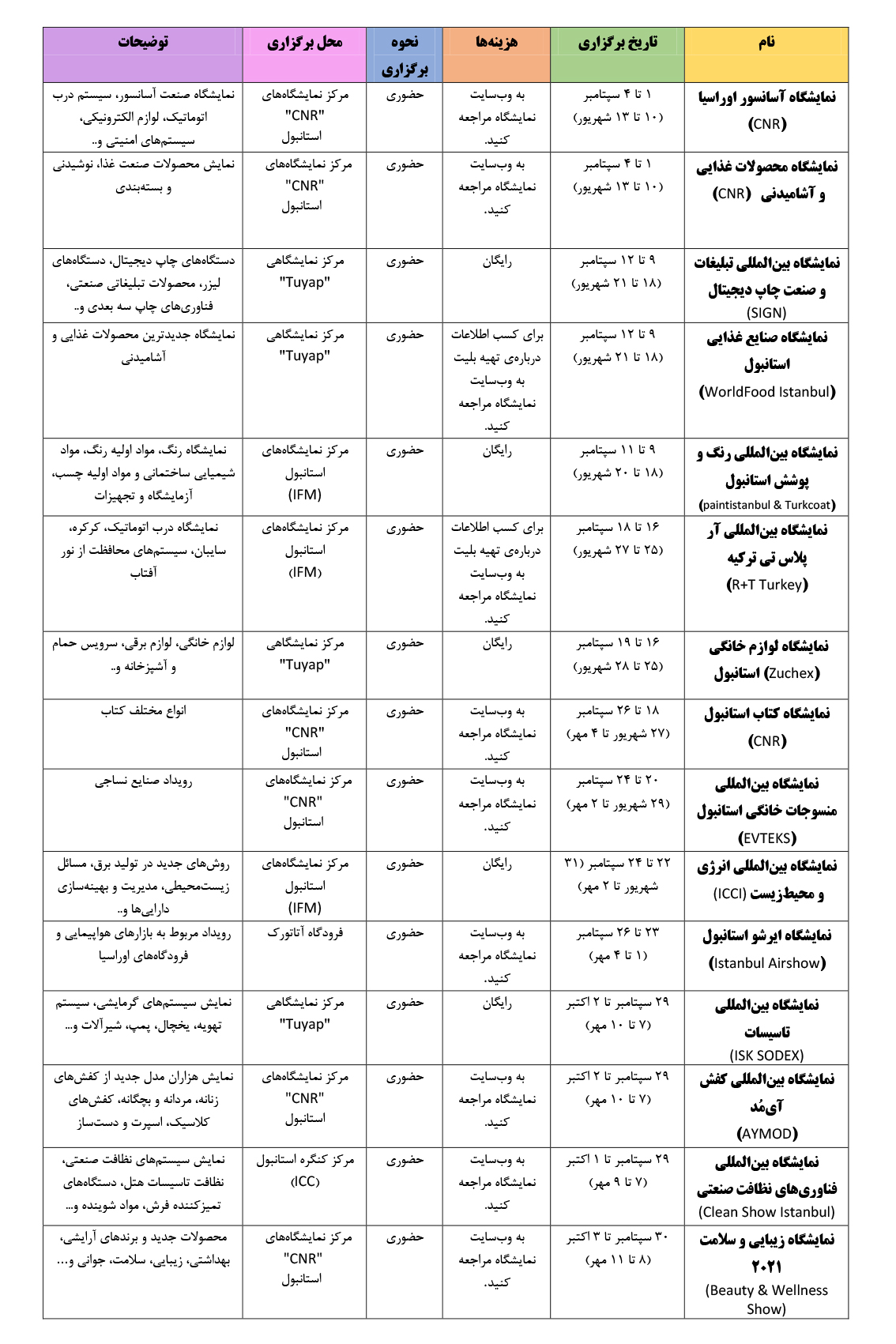 فهرست نمایشگاه های استانبول در ماه سپتامبر: