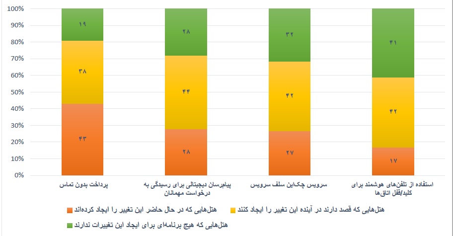 بر اساس آمارها، پیادهسازی و راهاندازی تکنولوژیهای بدون تماس در صنعت گردشگری، بهویژه در صنعت هتلداری، در دوران همهگیری ویروس کرونا با افزایش چشمگیری روبهرو شده است. در جدول زیر درصد استفاده از تکنولوژیهای بدون تماس در صنعت هتلداری را مشاهده کنید: