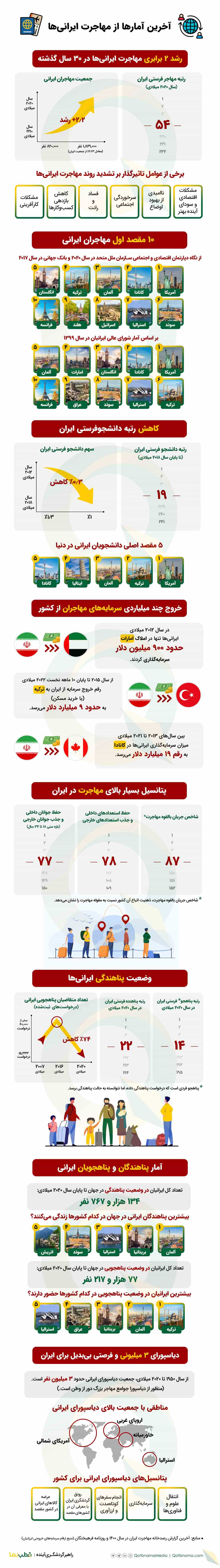 البته نگاهی به آمار جمعیت مهاجران ایرانی در طی چند دهه اخیر، نشان میدهد روند مهاجرت ایرانیها سیر صعودی داشته است. جمعیت مهاجران ایرانی در سال ۱۹۹۰ میلادی، حدود ۸۲۰ هزار نفر بوده که این رقم در سال ۲۰۲۰ میلادی، به یک میلیون و ۸۶۹ هزار نفر رسیده و معادل ۲.۲۳ درصد از جمعیت ایران است؛ این یعنی در ۳۰ سال گذشته، جمعیت مهاجران ایرانی ۲.۲ برابر شده است.