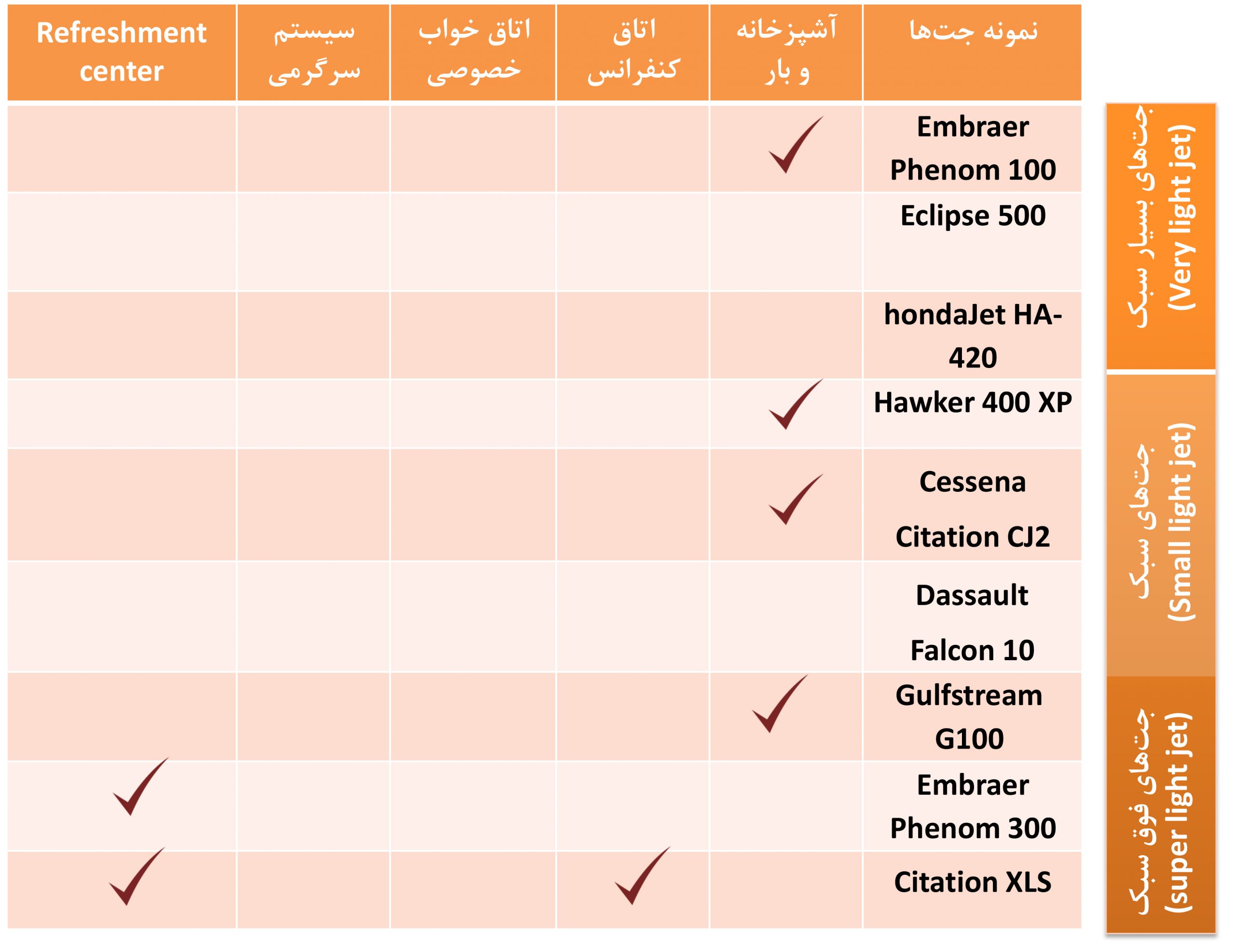ظرفیت: ظرفیت این جتها بهطور معمول بین ۴ تا ۷ نفر است و فضایی برای خدمهی کابین وجود ندارد.