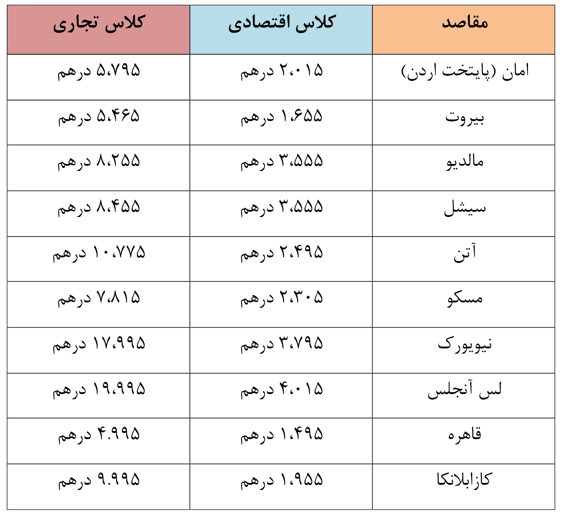 نرخهای ویژهی هواپیمایی امارات برای پروازهای تابستانه سال ۲۰۲۱ (۱۴۰۰-۱۳۹۹) عبارتند از: