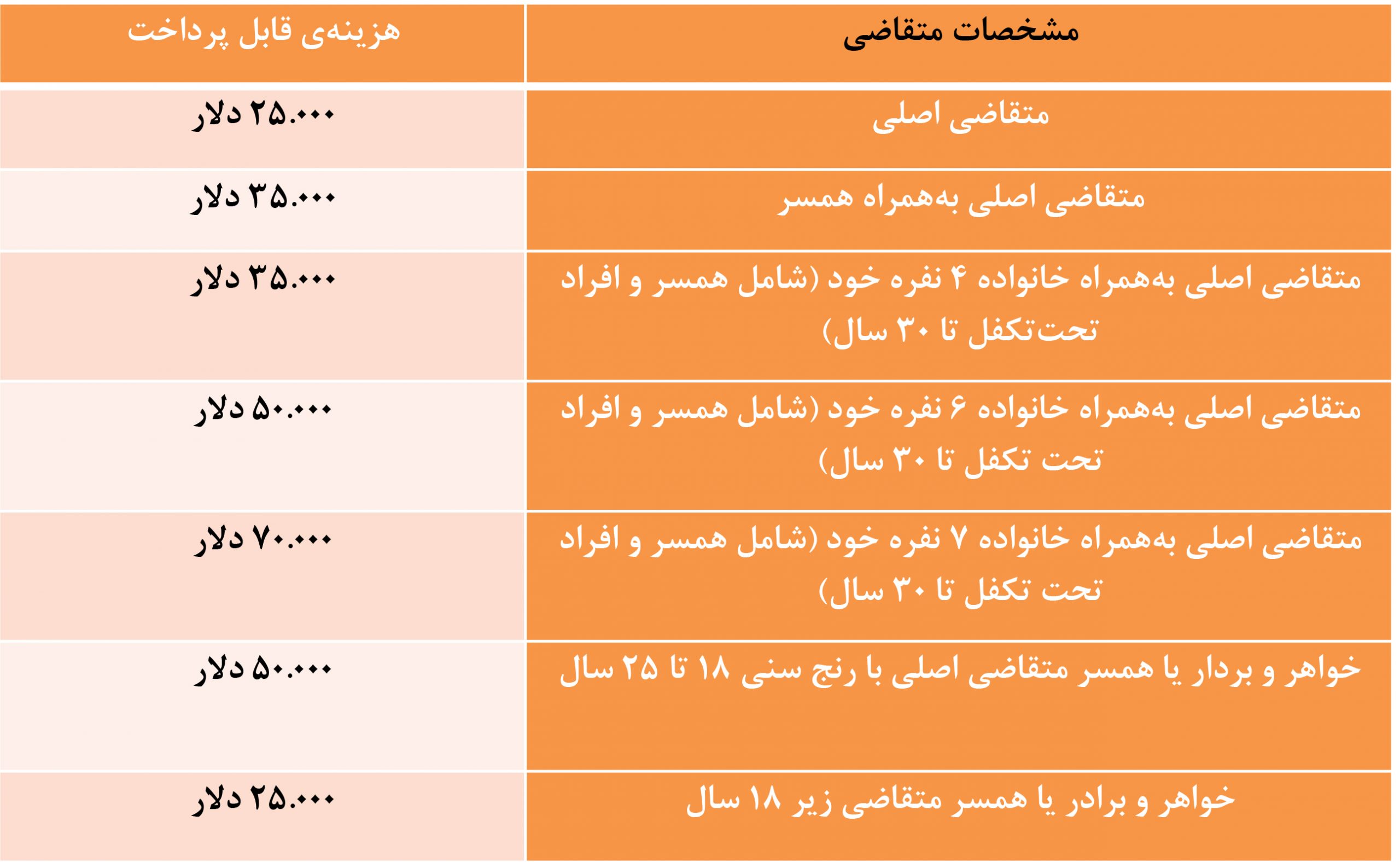مبلغ قابلقبول برای سرمایهگذاری در پروژههای دولتی حداقل ۱۰۰.۰۰۰ دلار بوده و متناسب با تعداد و سن متقاضیان متغیر خواهد بود.